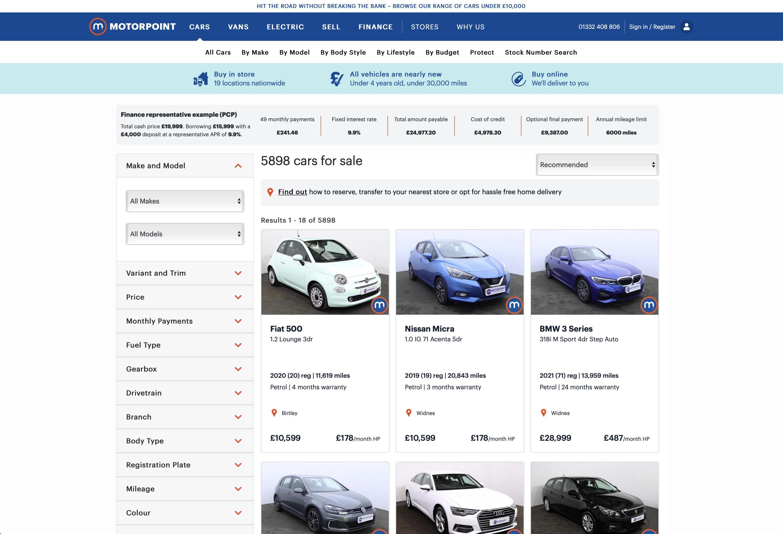 Once you’ve searched for your ideal car, you’ll be able to browse their stock, reviewing your options based on the car’s warranty period, mileage, age, and specific model. Motorpoint will also display where the vehicle is located, which can be helpful for those looking to pick up the car themselves.